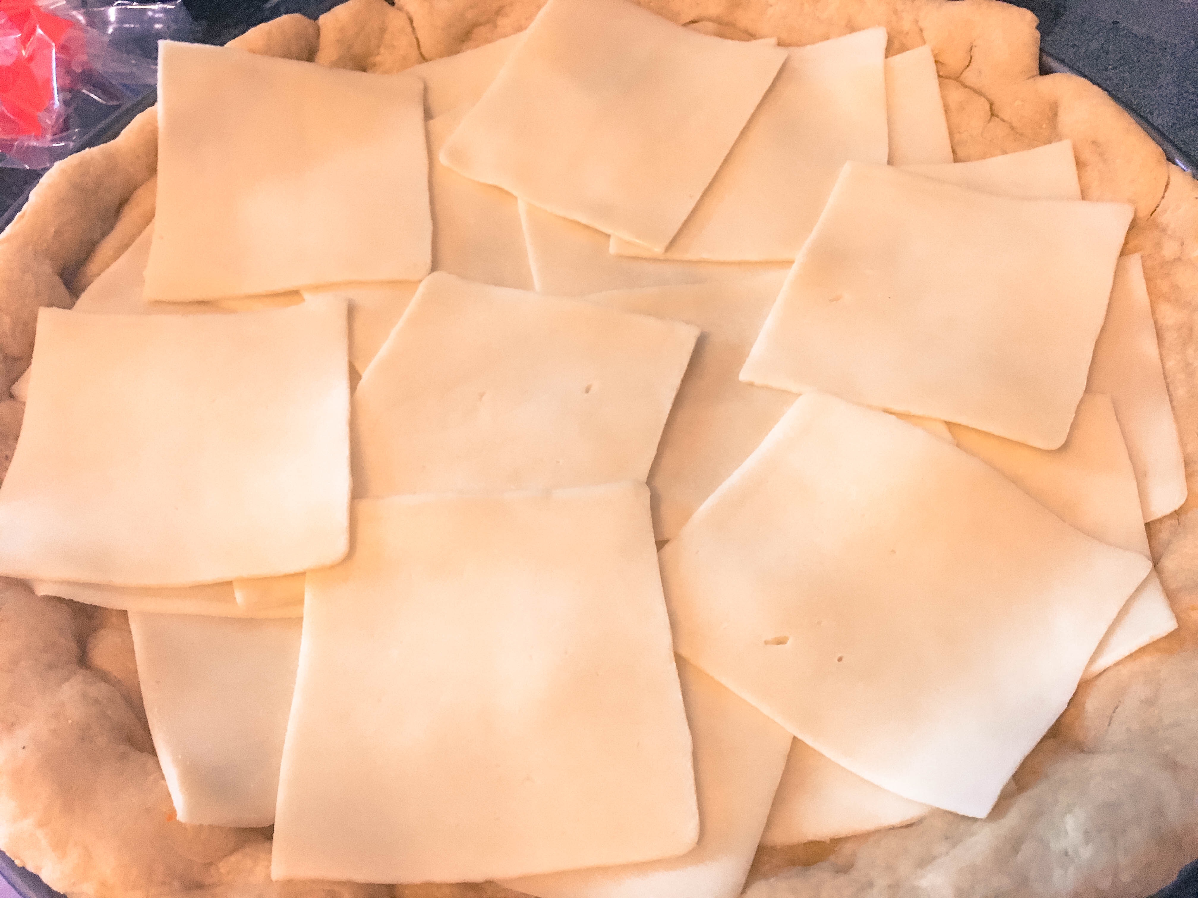 Next, top the crust with 1 lb of sliced mozzarella.