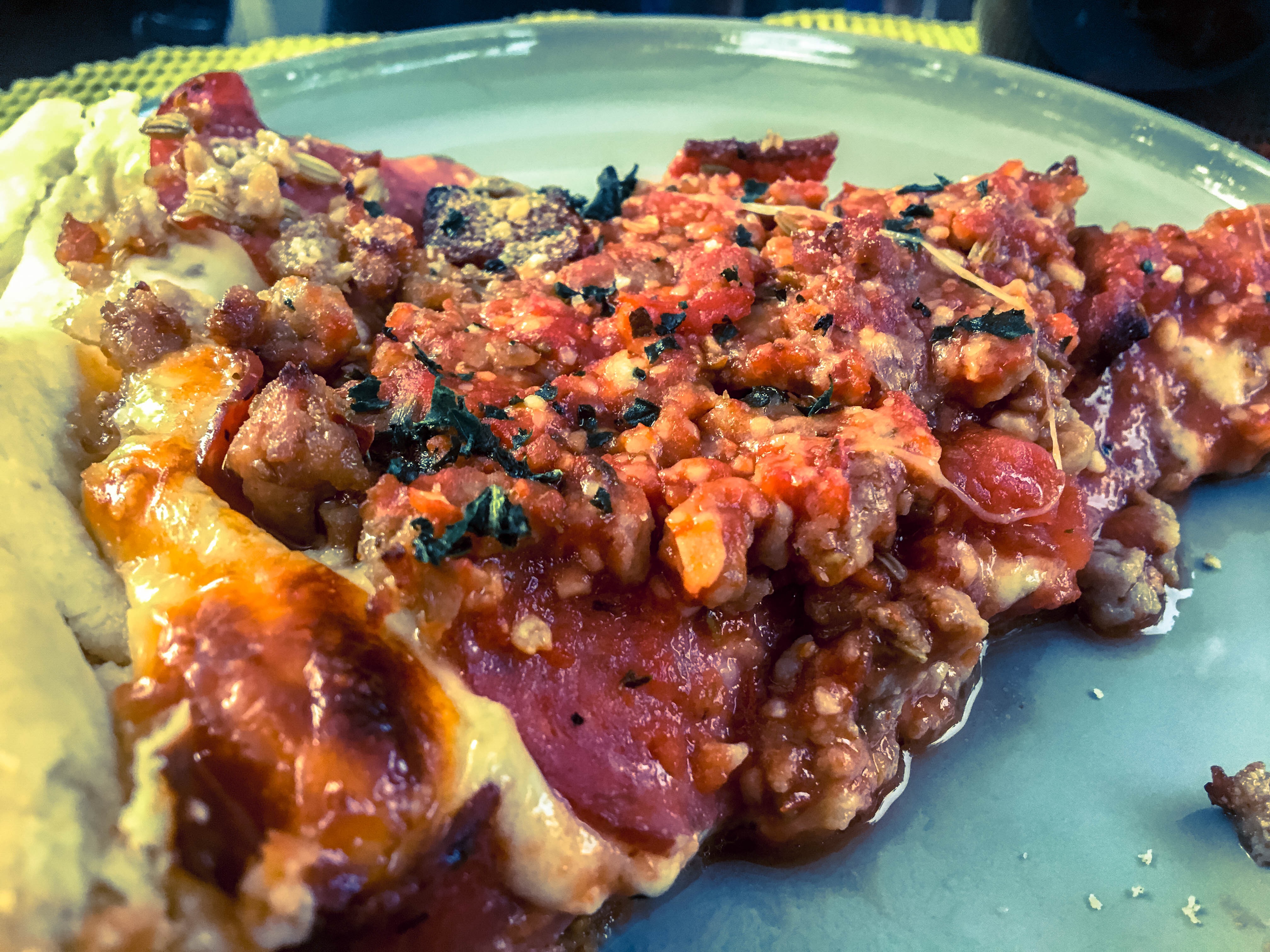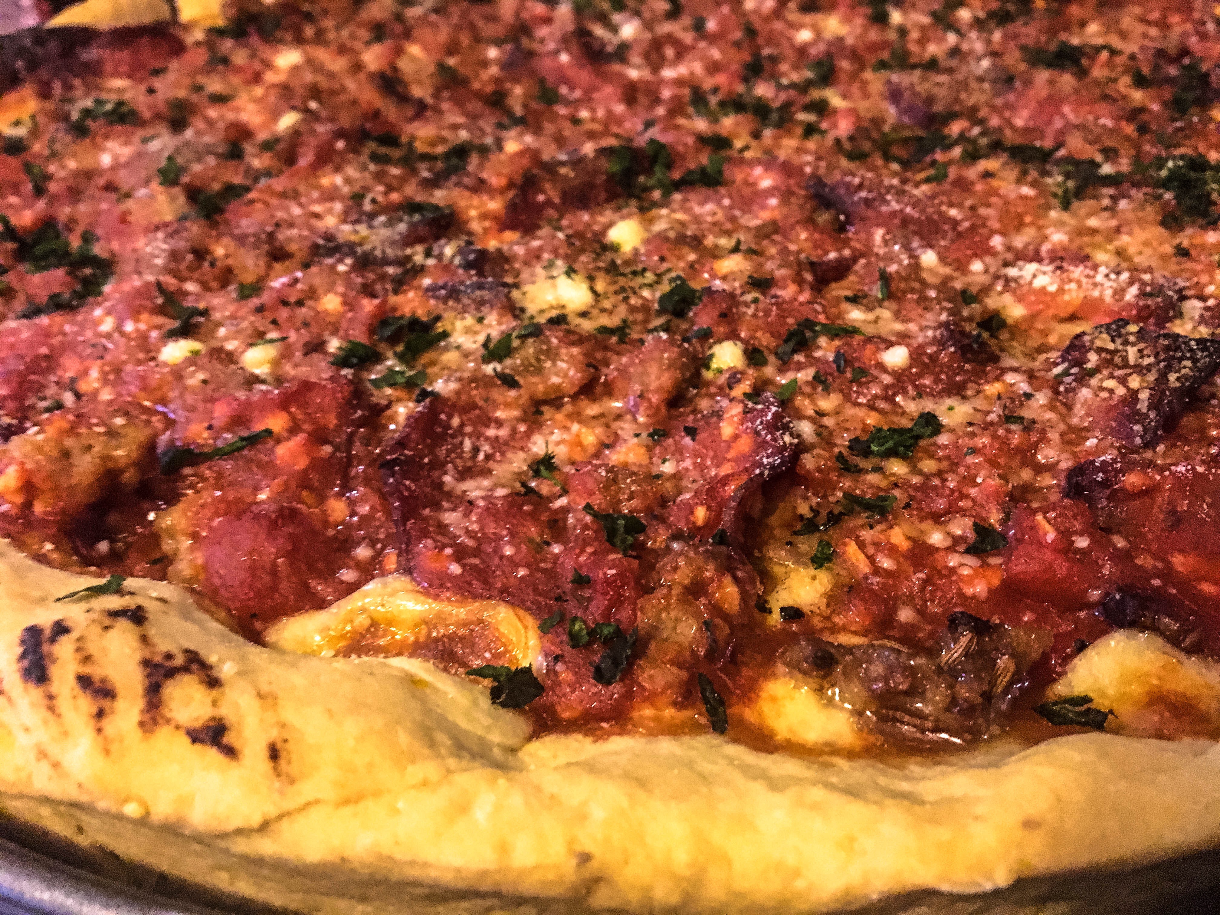 This should be a smoky, meaty and cheesy affront to thin crust.