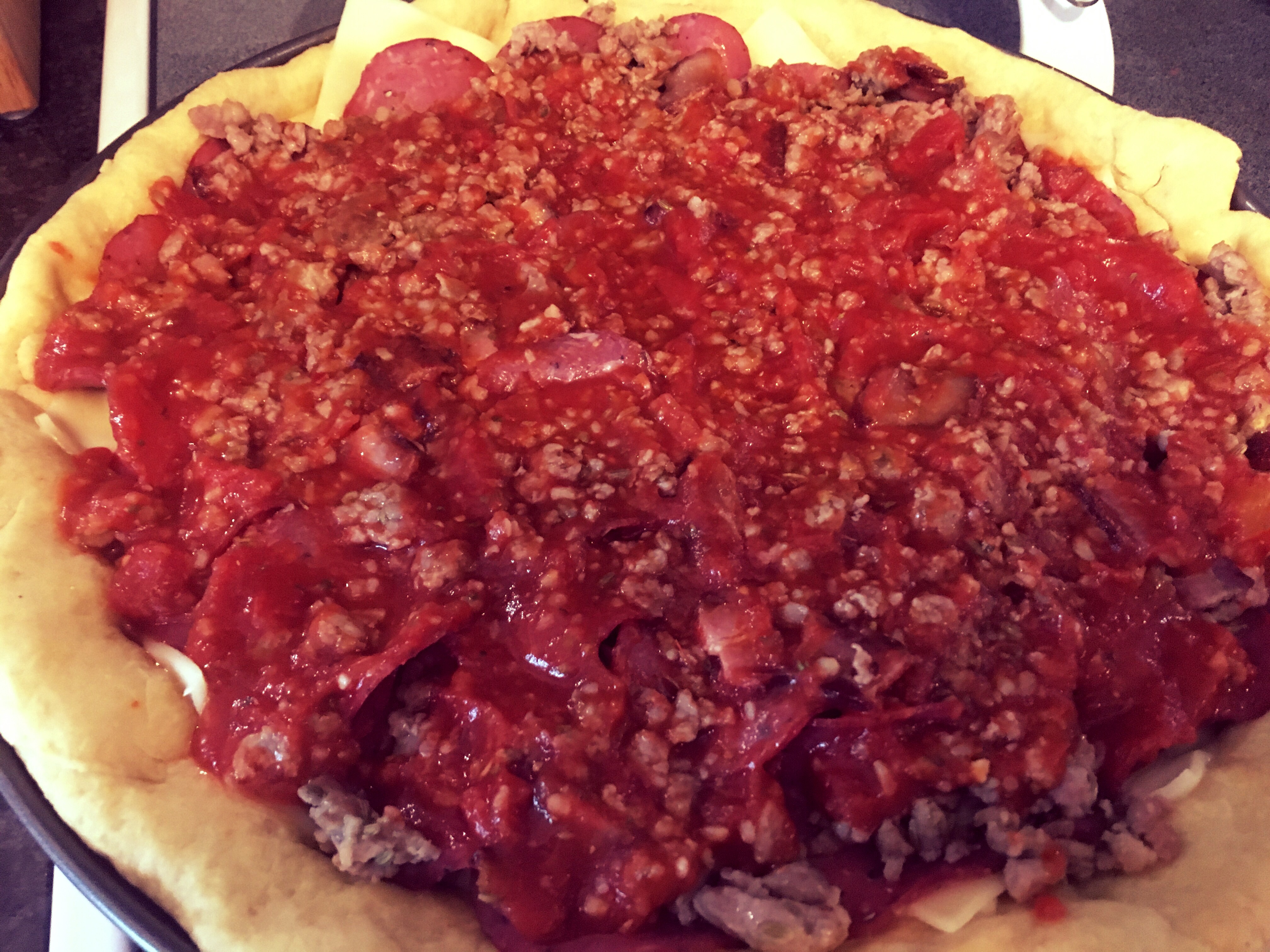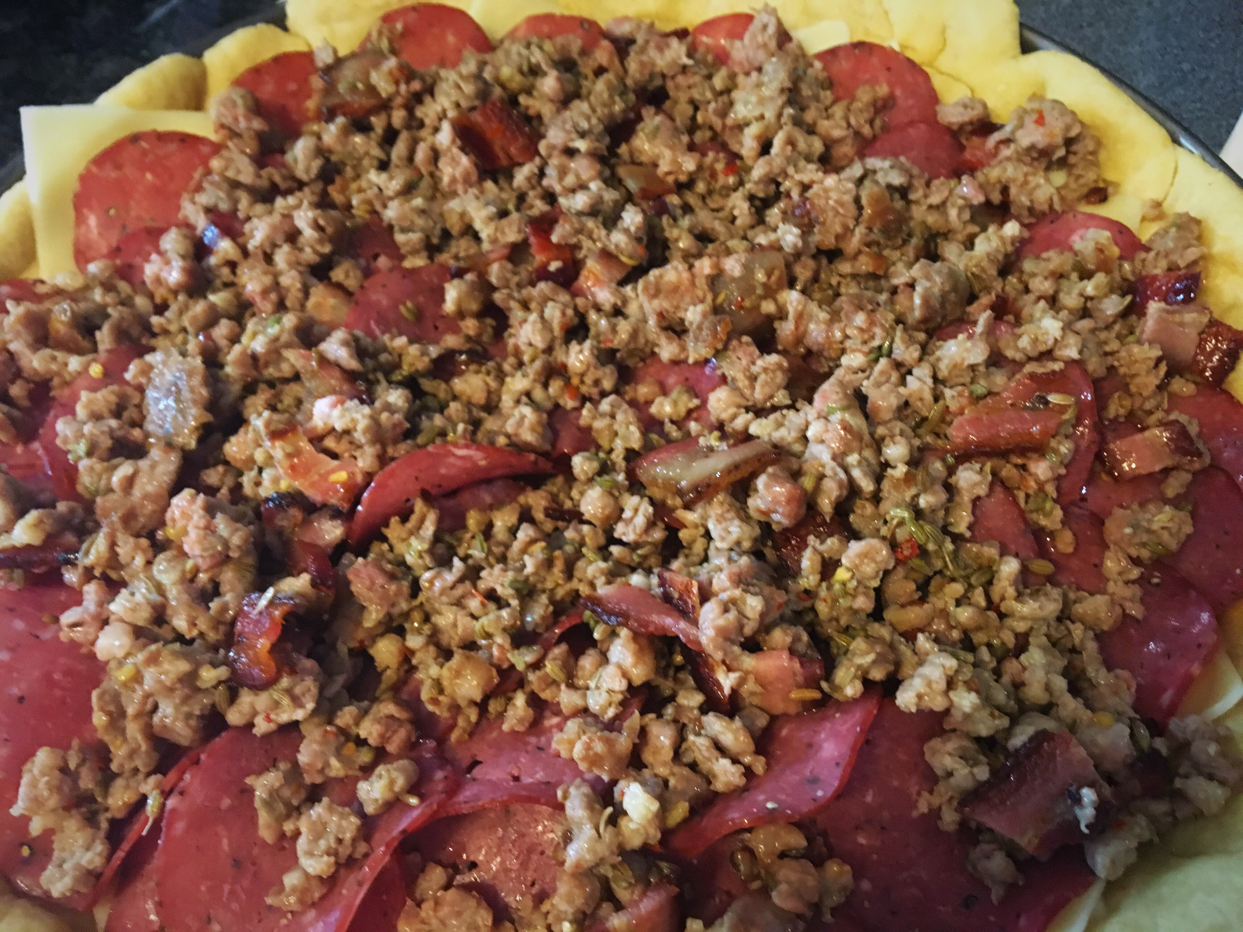 Who doesn’t love Deep Dish? I am not trying to reinvent the wheel, but I think I have put together a decent recipe for a homemade pie. We are going to make a meat lovers pizza because Zombies love meat – duh. FYI, all of the meat was purchased at Thurn’s, a butcher shop/pork store that has been operating in South Columbus since 1867.