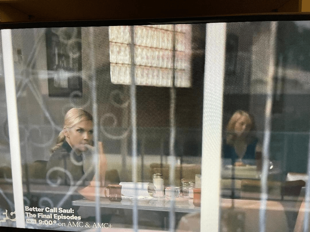 So as the curtains rapidly descend upon BCS creators Vince Gilligan and Peter Gould’s Albuquerque universe, where does that lead us in wrapping up BCS? I am guessing towards Kim’s emotional breakdown and arrest. Don’t believe me? Check out this screen shot I took (apologies for the poor quality) from episode 5 of season 6A. As Kim sits at her office/favorite Mexican restaurant and contemplates life choices, the shot is framed as to appear that Kim is in a jail cell.